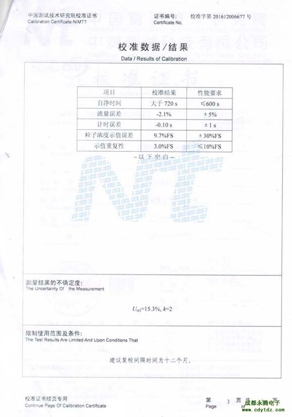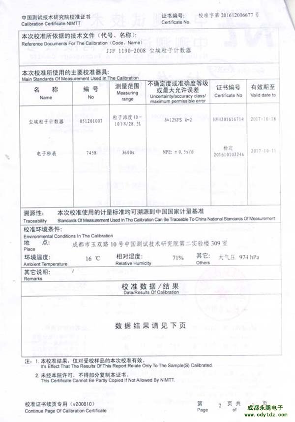 成都永騰電子塵埃粒子計數(shù)器檢驗報告